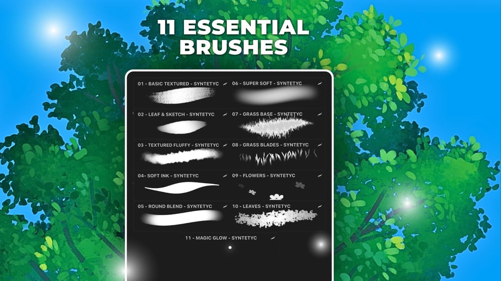 It's an easy to handle set, with the essential brushes for every step of the process of creating advanced anime-style artwork. From grass texture, tree foliage, fluffy clouds and beautiful flowers, to all the elements of an anime scene.