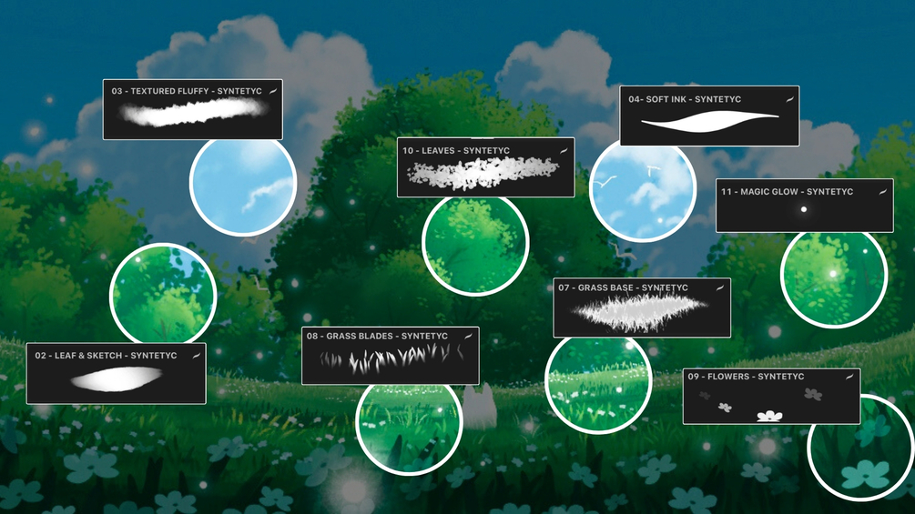 It's an easy to handle set, with the essential brushes for every step of the process of creating advanced anime-style artwork. From grass texture, tree foliage, fluffy clouds and beautiful flowers, to all the elements of an anime scene.
